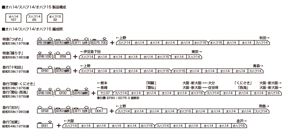 • スハフ14/オハフ15は変換式愛称表示採用。「急行」「つばさ」「踊り子(イラスト)」「(無地)」