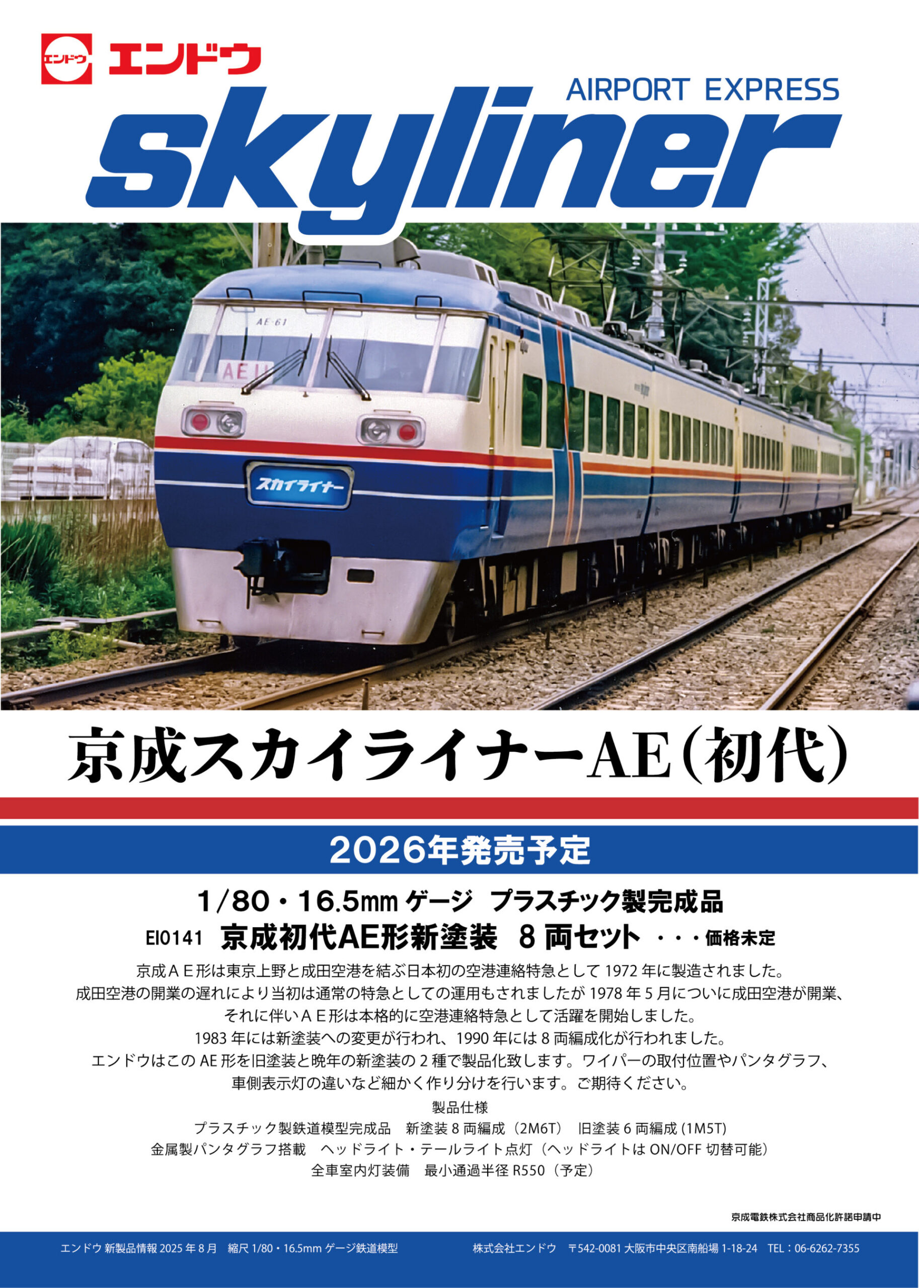 エンドウからHOゲージの「京成スカイライナー AE(初代)」が、発売されます。