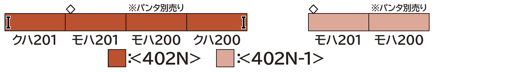 • 別売りの<402N-1>増結用中間車2両セットを組み合わせることで、10両固定編成、6両および4両編成(分割編成)が製作可能