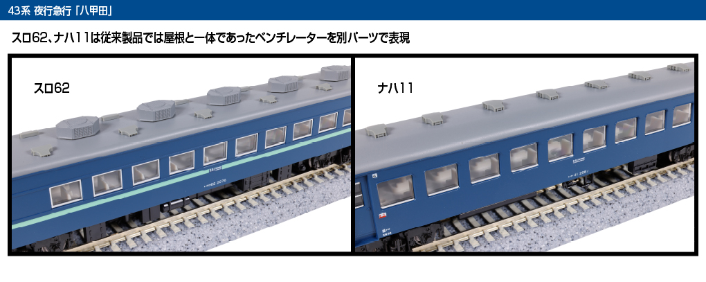 - スロ62、ナハ11は従来製品では屋根と一体であったベンチレーターを別パーツで表現