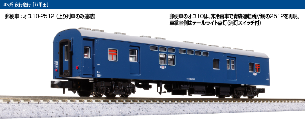 - 郵便車のオユ10は、非冷房車で青森運転所所属の2512を再現。車掌室側はテールライト点灯(消灯スイッチ付)